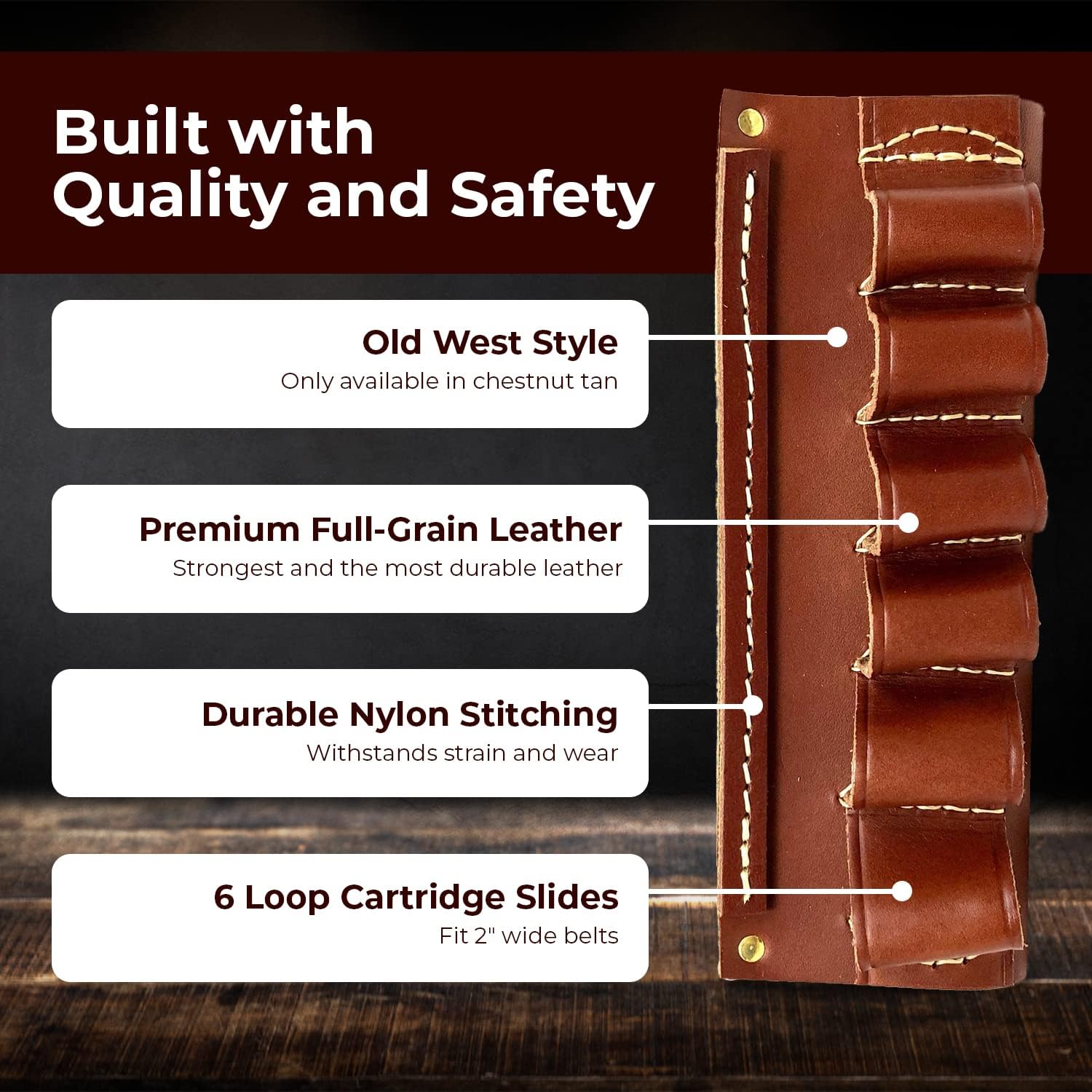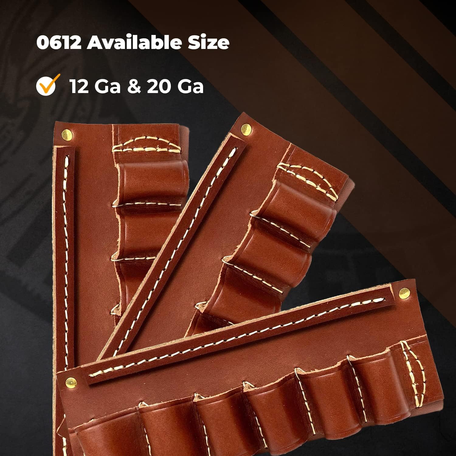 6 loop belt slide holds 44/45 caliber shells. Made from chap leather with heavy nylon stitching. Will accommodate up to a 2 inch belt.