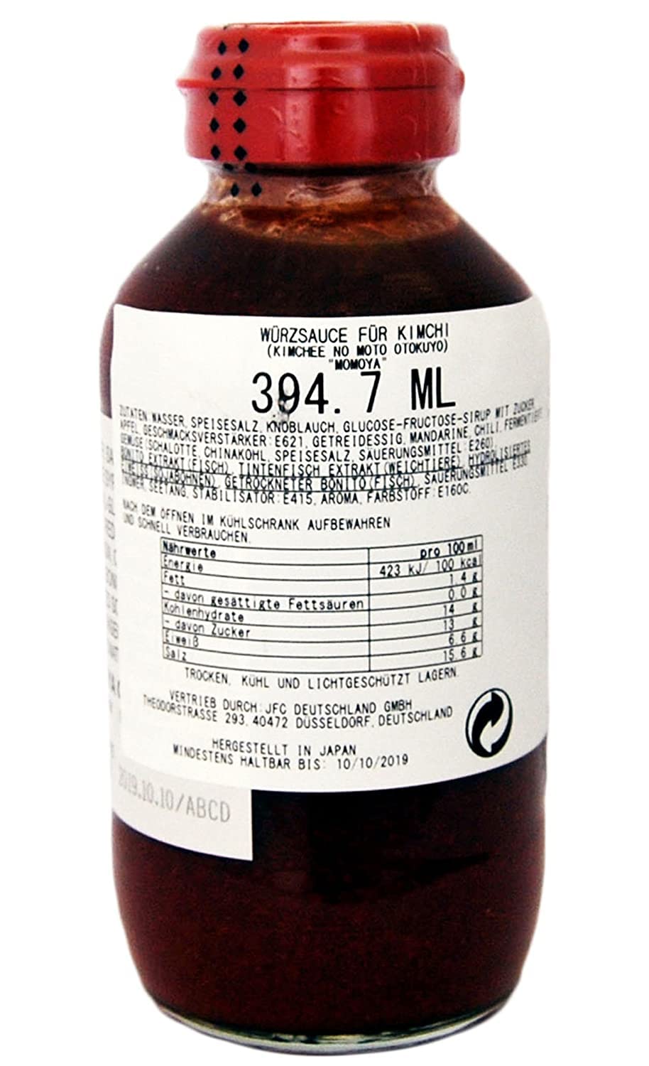 Ingredients : WATER, SALT, GARLIC, SUGAR GLUCOSE FRUCTOSE SYRUP (FROM CORN), APPLE, MONO SODIUM L-GLUTAMATE, VINEGAR, MANDARIN ORANGE, RED PEPPER, PICKLED VEGETABLES (SCALLION, CHINESE CABBAGE, SALT, ACETIC ACID), BONITO STOCK, SQUID EXTRACT, HYDROLYZED SOY PROTEIN, DRIED BONITO, CITRIC ACID, GINGER, TANGLE, XANTHAN GUM, DISODIUM SUCCINATE, PAPRIKA COLOR.