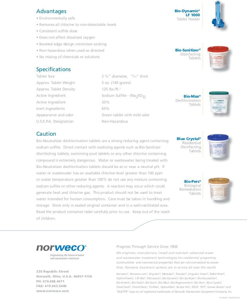 Bio-Neutralizer Tablets are an ideal way to eliminate chlorine from water and wastewater and meet stringent limits on chlorine residual Norweco's Bio-Neutralizer tablets release an environmentally safe dose of sodium sulfite in response to flow velocity. Effectively removing chlorine to non-detectable levels, the sodium sulfite contained in Bio-Neutralizer reacts instantly with chlorine eliminating the need for a secondary contact tank. Extensively used in commercial wastewater treatment, Bio-Neutralizer tablets are also used to remove chlorine from cooling towers, potable water plant back flush and fire hydrant flushing. Non-hazardous and not regulated by USEPA, Bio-Neutralizer tablets are available in 25 and 45 lb. DOT approved and child resistant containers Dechlorination Tablets Bio-Neutralizer dechlorination tablets are formulated to effectively remove free and combined chlorine from water or wastewater treatment system flows. Containing environmentally safe sodium sulfite as the active ingredient, Bio-Neutralizer tablets provide consistent reduction or elimination of residual chlorine without affecting water quality, dissolved oxygen or other discharge parameters. Bio-Neutralizer tablets automatically adjust their dissolve rate in direct proportion to the incoming flow rate, to provide consistent chlorine removal up to intermittent peak flow factors of four. Optimum dechlorination rates are uniformly maintained even when the significant runoff period is six hours. When used in any approved gravity flow tablet feeder, Bio-Neutralizer tablets insure the effective reduction of chlorine residual while maintaining overall effluent quality. Bio-Neutralizer tablets are packaged in easy to open, resealable 25 lb. and 45 lb. Department of Transportation approved containers